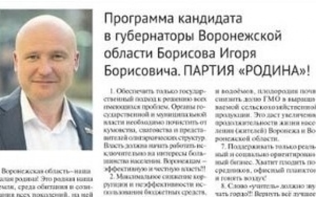 "Время их выхода конечно не самое удачное в 9.34 (Россия 1) и 10.00 (Россия-24). Но это нисколько не останавливает меня! Нужно максимально донести свои посылы до каждого жителя области. И использовать для этого любые возможности. Радиоэфир проходит в 11.00 (радио Маяк) и в 20.10 (радио России)", - рассказал председатель регионального отделения партии "РОДИНА", кандидат на пост Губернатора Воронежской области Игорь Борисов.
