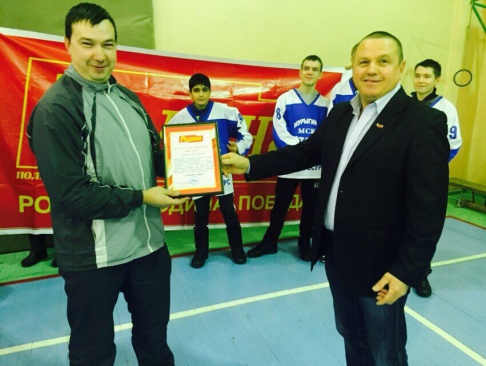 Ну а в завершении встречи, тренерскому составу и молодым хоккеистам были вручены почетные грамоты и благодарственные письма, а также сертификат на приобретение спортивного инвентаря.