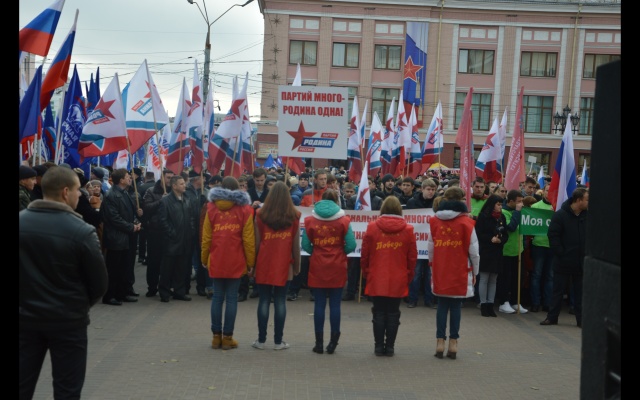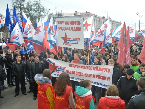 Брянские родинцы, захватывающие все больше политического пространства, заняли место у трибун и оказались во главе участников митинга. Лозунги партии в День народного единства: "Национальностей много, а нация одна - народ России!", "Партий много - Родина одна!"